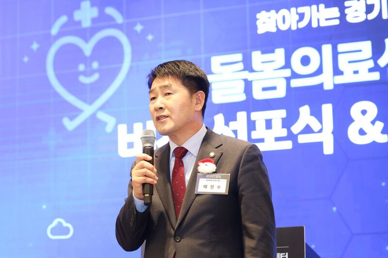 화성특례시 돌봄의료센터 비전 선포식에서 배정수 화성특례시의회 의장이 축사를 통해 화성형 통합돌봄의료체계의 성과를 공유하고, 시민 삶을 지키는 연속적 돌봄의 중요성을 강조하고 있다. 사진=화성특례시의회
