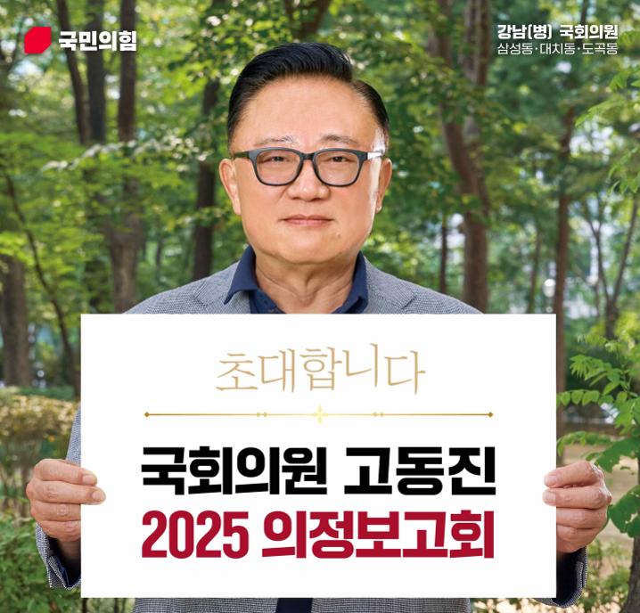 국회 행정안전위원회 소속 고동진 국회의원(국민의힘·서울 강남구병)이 오는 1월 8일 오후 1시 강남구민회관 대강당에서 ‘2025 의정보고회’를 열고, 제22대 국회 입성 이후의 주요 의정활동과 지역 현안 추진 성과를 주민들에게 직접 보고한다.