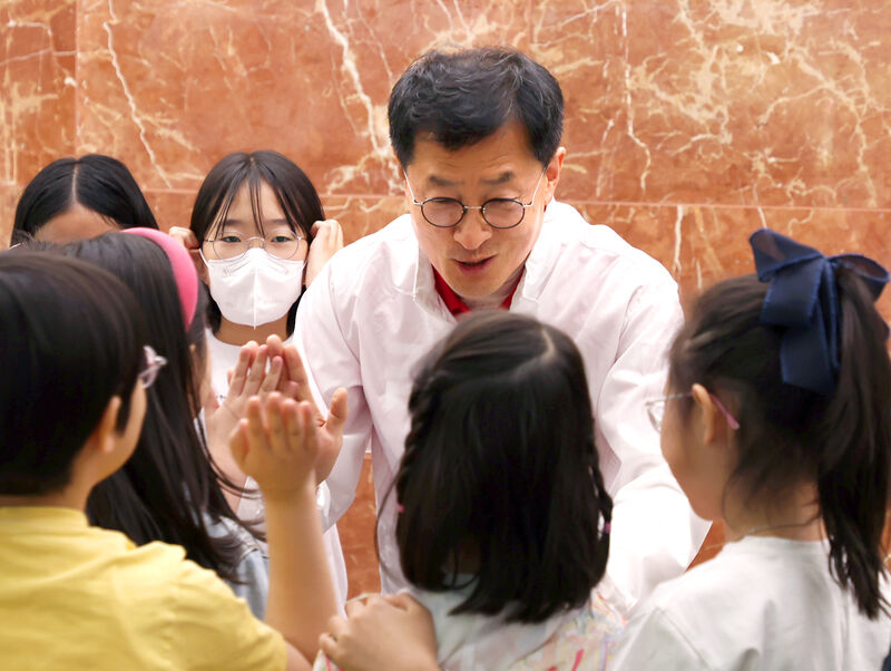 성남의 지속가능한 성장을 위한 도시 계획의 투명성 확보, 디지털 기반의 행정 혁신, 그리고 중소상공인의 경쟁력 강화를 주요 의정 목표로 두고 있다는 박종각 의원. 사진은 성남시의회에 찾아온 초등학생들을 박종각 의원이 반갑게 맞아주고 있는 모습. 사진=성남시의회