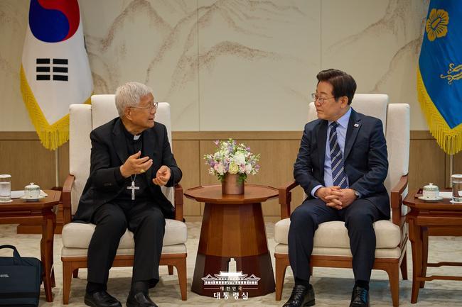이재명 대통령이 7일 오후 2시 대통령실에서 교황청 성직자부 장관 유흥식 추기경을 접견하고 한반도 평화와 민주주의 회복을 위한 교황청의 역할과 협력 방안을 논의했다.