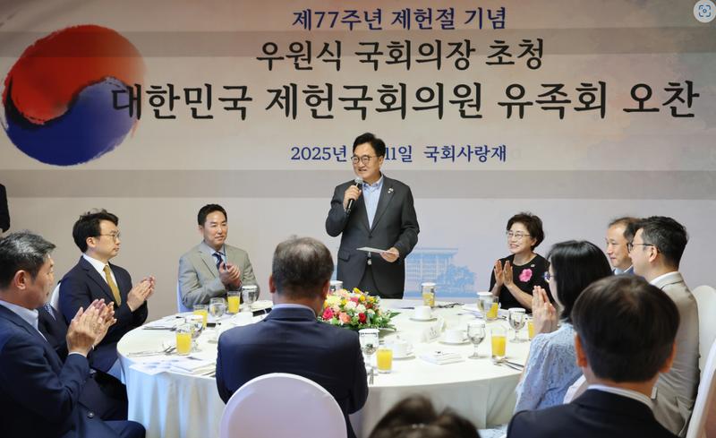 우원식 국회의장은 7월 11일, 제77주년 제헌절을 앞두고 ‘대한민국 제헌국회의원 유족회’ 회원들을 국회 사랑재로 초청해 오찬을 함께하며 헌법정신의 뿌리를 되새기는 뜻깊은 자리를 마련했다.