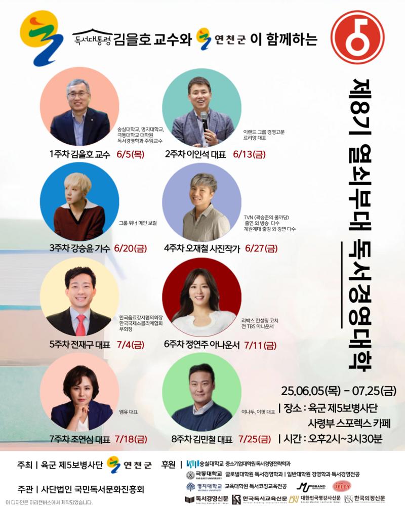 연천군(군수 김덕현)과 육군 제5보병사단(사단장 윤기중, 이하 5사단)이 공동 주최하고, (사)국민독서문화진흥회(회장 김을호)가 주관한 '제 8기 열쇠부대 독서경영대학'의 7차시 강의가 2025년 7월 18일(금) 오후 2시부터 약 90분간, 육군 제5보병사단 스포렉스 북카페에서 열렸다.
