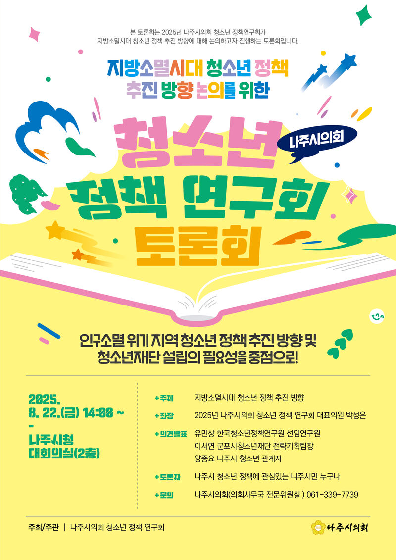 나주시의회 의원 연구단체 ‘나주시 청소년 정책 연구회’(대표의원 박성은)가 지방소멸 위기 속 청소년 정책의 새로운 비전과 과제를 모색하기 위한 자리를 마련한다. 연구회는 오는 8월 22일(금) 오후 2시, 나주시청 대회의실에서 「지방소멸 시대 청소년 정책 추진 방향」을 주제로 토론회를 개최한다고 7일 밝혔다.
