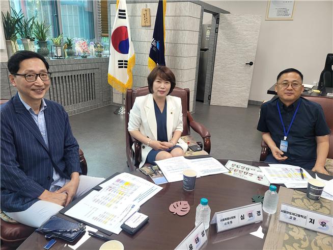서울시의회 심미경 의원(가운데)이 카이스트 윤태영 교수, 교육청 및 학교 관계자들과 반도체고 교육과정 개편 현황 점검을 하고있다. 사진제공=심미경 의원