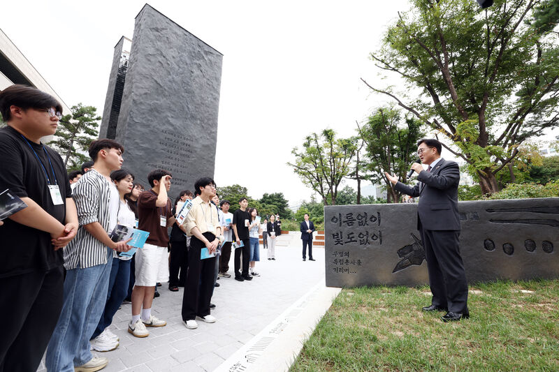우원식 국회의장이 국회를 찾은 대학(원)생 아카데미 학생들에게 직접 국회 독립기억광장과 국회 상징석의 의미를 설명하며 민주주의와 헌정질서의 가치를 되새겼다.