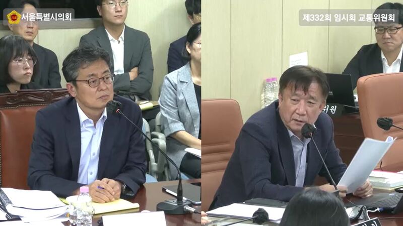 서울특별시의회 제332회 임시회 교통위원회에서 경기문 의원(국민의힘, 강서6·오른쪽)이 교통종사자 음주운전 관리체계 문제를 지적하며 질의하고 있다. 사진=서울시의회