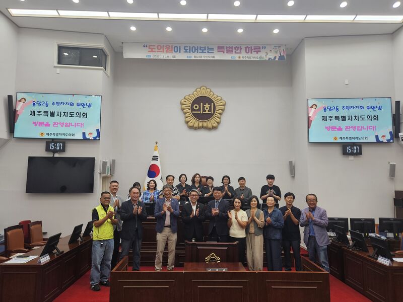 제주특별자치도의회(의장 이상봉)는 9월 26일 오후 3시, 도의회 본회의장에서 용담2동 주민자치회(회장 강행복) 위원 19명이 참석한 가운데 모의의회 형식의 ‘의정체험 프로그램’을 개최했다. 이번 행사는 올해 새롭게 출범한 용담2동 주민자치회 위원들을 대상으로, 지방의회의 역할과 기능을 직접 체험하고 민주적 의사결정 과정을 몸소 경험할 수 있도록 마련된 의미 있는 자리다.