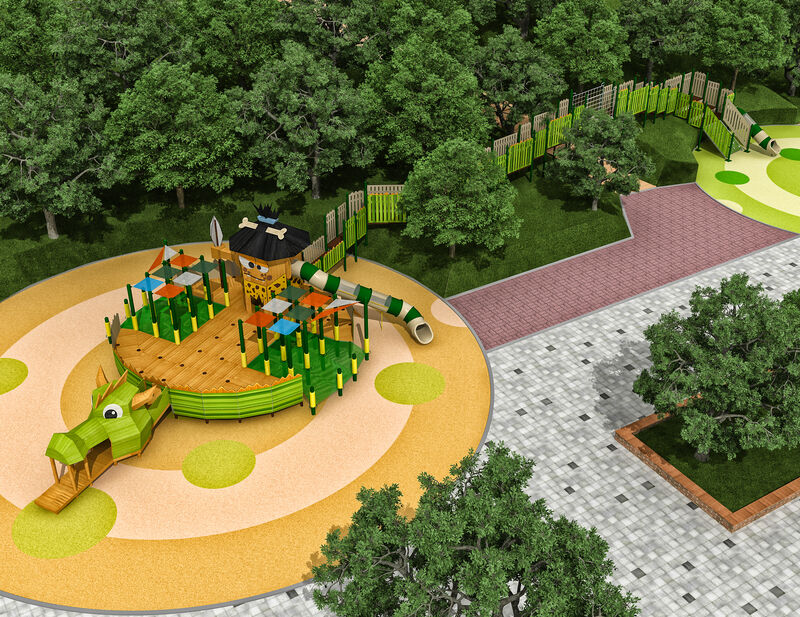 특히 놀이터는 ‘원시인 소년 뭉치를 등에 태운 공룡 뭉치노의 여행’이라는 독창적인 테마로 설계되었다. 자연 지형을 최대한 보존하면서 공룡 머리에서 꼬리까지 이어지는 동선을 따라 난이도별로 구분된 놀이시설을 배치해, 어린이들이 스스로 모험을 설계하고 도전할 수 있는 공간으로 꾸며졌다.