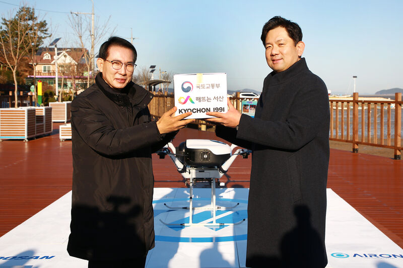 2022년 12월 8일 서산시 지곡면 중리포구에서 열린 드론 상용화 서비스(섬지역 주민 치킨 배달) 시연회는 서산 지역 산업의 재도약과 시민 삶의 편의 향상, 그리고 미래 기반이 차근히 마련되고 있음을 보여주는 모습이다. 사진=서산시