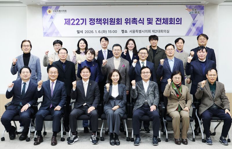 서울특별시의회는 지난 1월 6일 의원회관에서 제22기 정책위원회 위촉식과 전체회의를 열고 위원들에게 위촉장을 수여했다. 이날 행사는 의회의 정책 역량 강화를 상징하는 자리로, 정책 연구와 입법 지원을 통해 ‘정책의회’ 구현을 가속화하겠다는 의지를 재확인하는 계기가 됐다. 위촉식에는 최호정 의장을 비롯한 관계자들이 참석했다.