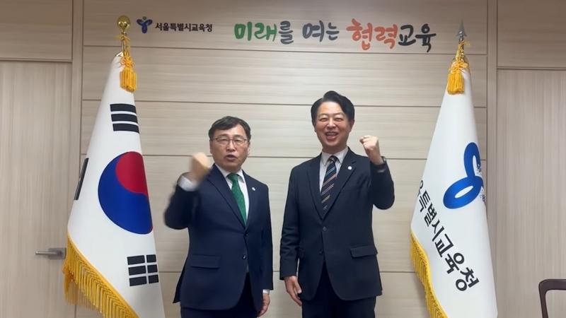 김영호 국회 교육위원장과 정근식 서울시 교육감이 [김영호 TV]에서 대담을 나누고 함께 기념촬영을 하고 있다. 사진=김영호 TV 갈무리