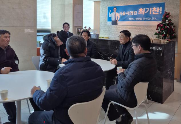 한편 최기찬 의원은 현장 중심 의정활동에도 힘을 쏟고 있다. 지난 7일에는 최 의원의 추천으로 서울시의회 의장 표창을 받은 개인택시조합 남서지부 소속 택시 기사들에게 직접 표창을 전달하고, 간담회를 통해 현장의 애로사항을 청취했다. 표창을 받은 기사들은 교통 질서 확립과 지역 봉사에 헌신한 공로를 인정받은 인물들로, 이 자리에서 통신비 부담을 비롯한 현실적인 어려움을 호소한 것으로 전해졌다.
