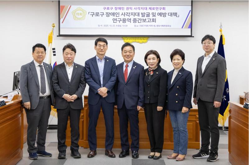 구로구의회(의장 정대근) 의원 연구단체인 ‘구로구 장애인 권익 사각지대 제로 연구회’는 지난 10월 22일 구로구의회 행정기획위원회 회의실에서 ‘구로구 장애인 복지 사각지대 발굴 및 예방 대책’ 연구용역 중간보고회를 개최했다. 이날 보고회에는 연구단체 대표의원인 곽노혁 의원을 비롯해 정대근 의장, 김용권 의원(간사), 곽윤희 의원, 노경숙 의원, 변정열 의원, 홍용민 의원과 구로구청 장애인정책팀장, 연구용역 수행업체 관계자, 구로구의회사무국 직원 등 19명이 참석했다.