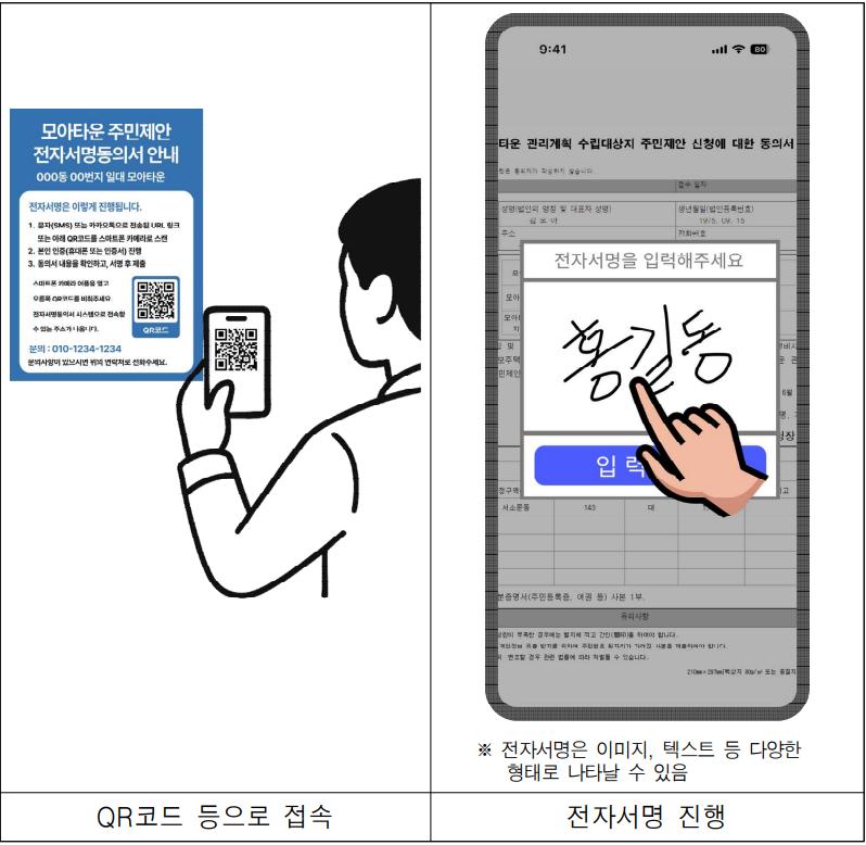 전자서명 방식은 추진주체가 시스템을 구축한 뒤, 주민에게 문자나 QR코드 등을 통해 접근을 유도하고, 주민은 본인인증을 거쳐 동의서를 확인하고 서명하는 방식이다.