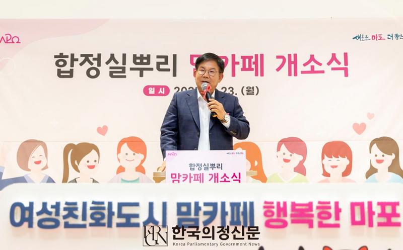 ‘합정실뿌리 맘카페’ 개소식에서 박강수 구청장이 축사를 하고 있다. 사진=마포구청