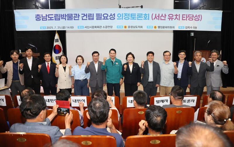 충남도의회는 7월 25일 서산문화회관 소공연장에서 「충남도립박물관 건립 필요성과 서산 유치 타당성」을 주제로 의정토론회를 개최했다. 이번 토론회는 김옥수 도의원(서산1, 국민의힘)이 좌장을 맡았으며, 박물관학·문화공간·디지털콘텐츠 등 다양한 분야의 전문가들이 참석해 충남형 도립박물관의 청사진을 제시했다.
