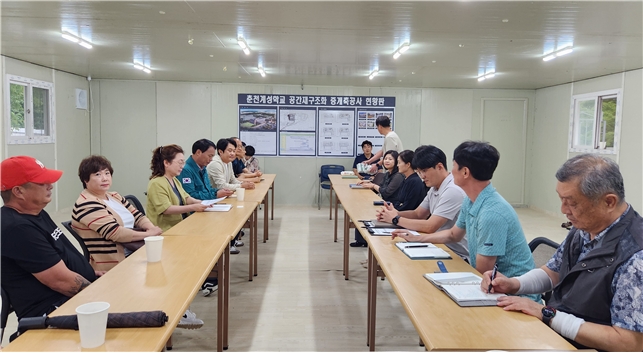 이날 현장 간담회에는 박기영 강원특별자치도의회의원, 김보건 춘천시의원, 마화선 후평2동 동장, 이정미 춘천계성학교 교장, 우하나 춘천교육지원청 시설팀장, 시공사 관계자 및 주민 10여 명이 함께 자리해 공사 진행 상황을 공유하고 현실적인 대책을 논의했다.