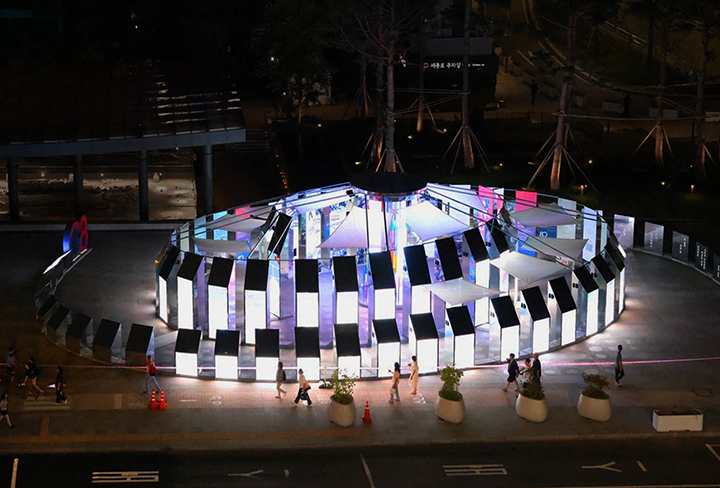 서울 광화문광장에 '빛으로 이어진 80년의 기록' 전시장이 설치 되어 있다. 사진=행정안전부 제공
