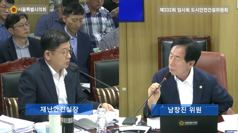 서울특별시의회 제332회 임시회 도시안전건설위원회 회의에서 남창진 의원(오른쪽)이 재난안전실장(왼쪽)에게 폭염 경보 발령 시 건설현장 안전 관리 실태와 대책에 대해 질의하고 있다. 사진=서울특별시의회