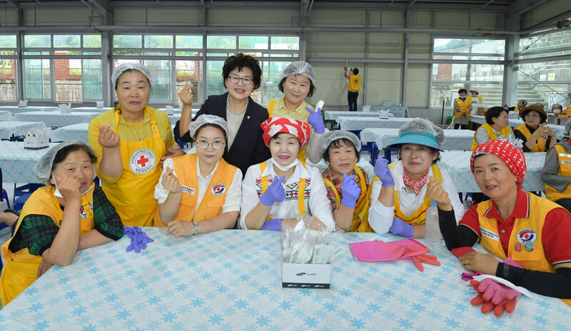 “모두가 함께 잘 사는 도시 논산”을 위해 길을 걷고 있는 민병춘 의원. 대한적십자봉사회 논산시지회, 5.8 세계 적십자의날 기념 어르신 효잔치에서 봉사하는 분들과 함께 하고 있다. 사진=논산시의회