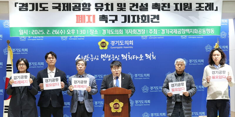 유호준 경기도의원이 ‘경기도 국제공항 유치 및 건설 촉진 지원 조례 폐지 촉구 기자회견’을 열고 발언하고 있다. 사진=경기도의회