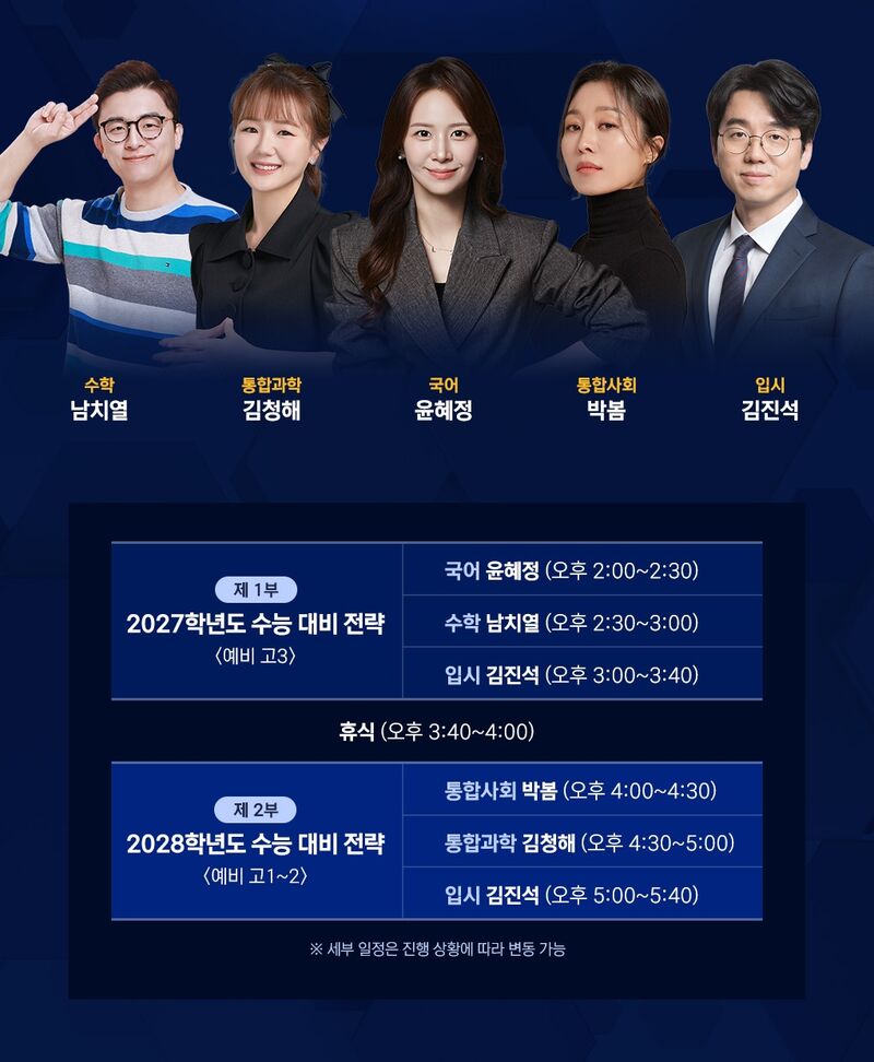 1부에서는 예비 고3 학생을 대상으로 국어 윤혜정, 수학 남치열, 입시전문가 김진석 강사가 2026학년도 수능 분석 내용을 중심으로 2027학년도 학습 전략을 안내한다. 2부에서는 예비 고1·고2 학생을 위한 2028학년도 개편 수능 대비 전략을 다루며, 개정 교육과정의 정책적 방향과 학습자가 준비해야 할 역량을 집중적으로 설명한다.