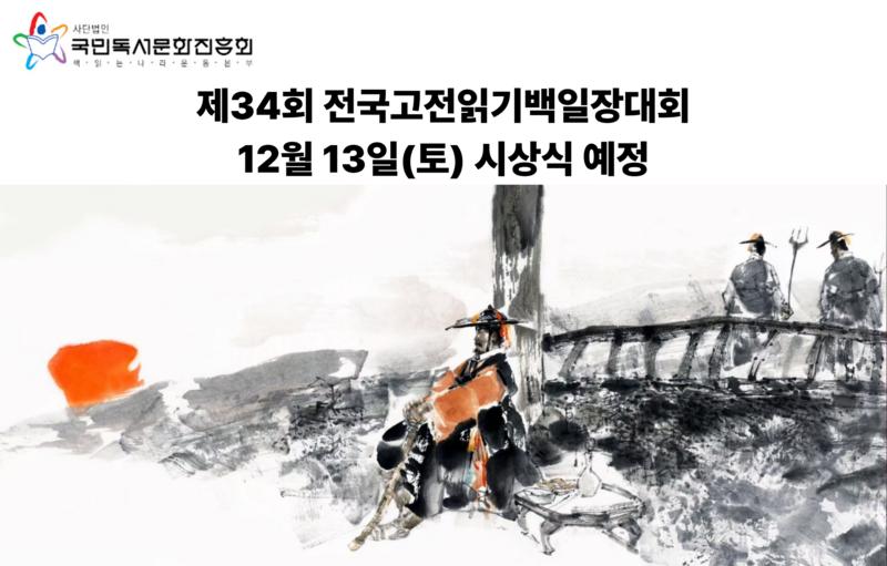 독서문화 진흥의 대표적 행사인 제34회 전국고전읽기백일장대회가 오는 12월 13일(토) 시상식을 진행할 예정이며, 우수한 성과를 거둔 학생들에게 상장과 상패가 수여된다. 이번 대회 본선은 이미 성료되었고, 전국 각지의 청소년들이 고전 독서를 바탕으로 사고력과 표현력을 겨루며 뜻깊은 시간을 만든 바 있다.