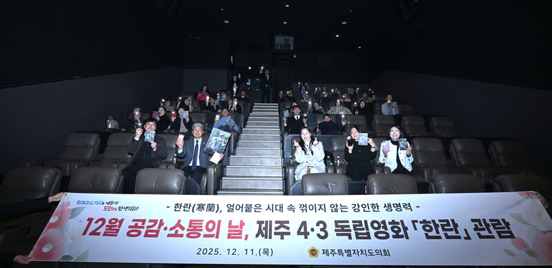 제주특별자치도의회가 영화 관람을 통해 제주4‧3의 역사적 의미를 되새기고 평화와 인권의 가치를 공유하는 시간을 마련했다. 도의회는 12월 11일 롯데시네마 제주연동점에서 의원과 사무처 직원 등 100여 명이 참여한 가운데, 제주4‧3을 배경으로 한 영화 ‘한란’을 단체 관람했다고 밝혔다.