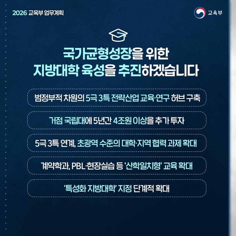 국가균형성장을 위한 지방대학 육성도 주요 정책 축이다. 교육부는 거점 국립대에 5년간 4조 원 이상을 추가 투자해 교육·연구의 질을 높이고, 지역 우수 인재의 수도권 유출을 막겠다는 방침이다. 2026년부터는 3개교를 시작으로 세계적 수준의 특성화 연구대학과 연구원을 단계적으로 설립해 지역 지산학연 허브로 육성한다.
