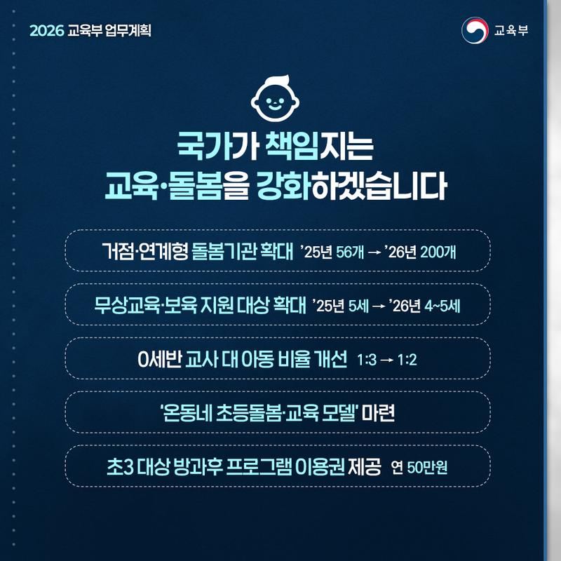 국가책임 교육 실현을 위해 정부책임형 유보통합이 추진된다. 무상교육·보육 지원 대상은 기존 5세에서 4~5세로 확대되고, 0세반 교사 대 아동 비율은 1대 2로 개선된다. 돌봄 취약지역의 거점·연계형 돌봄기관도 56개에서 200개로 확대된다.