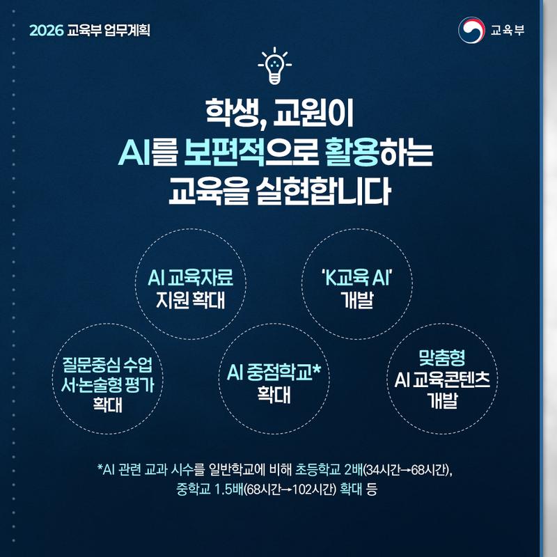 교육부는 학생과 교원이 AI를 일상적으로 활용하는 교육 환경 조성을 핵심 과제로 설정했다. 이를 위해 AI 교육자료를 학교가 자율적으로 선택·활용할 수 있도록 지원을 확대하고, 수업과 행정 전반에 활용 가능한 ‘K-교육 AI’를 개발한다. 질문 중심 수업과 서술·논술형 평가를 확대해 학생들이 AI를 주도적이고 비판적으로 활용할 수 있도록 수업 방식도 전환한다.