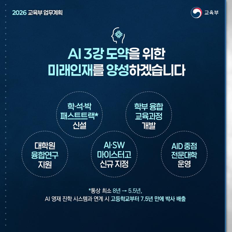 AI 3대 강국 도약을 위한 고급 인재 양성 정책도 본격화된다. 교육부는 혁신 학·석·박사 패스트트랙을 신설해 우수 인재의 조기 육성을 지원하고, 박사후연구원 제도화와 지원을 강화한다. 융합학부와 융합 교육과정 개발, 대학원 융합연구 지원을 통해 AI와 첨단 지식을 겸비한 융합형 인재를 양성한다.