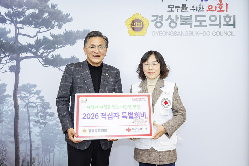 경상북도의회 박성만 의장은 12월 22일 도의회 의장실에서 대한적십자사 경북지사에 2026년도 적십자 특별회비를 전달하며 연말을 맞아 이웃사랑 실천에 동참했다. 이날 전달식은 한 해를 마무리하며 지역사회와 함께하는 나눔의 가치를 되새기는 자리로 마련됐다.