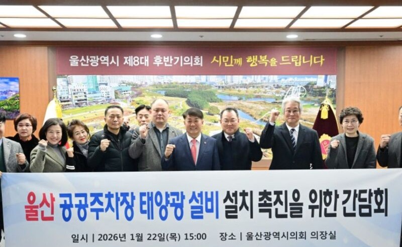 울산광역시의회 이성룡 의장은 지난 1월 22일 의장실에서 ‘울산광역시 공공주차장 태양광 설비 설치 촉진을 위한 간담회’를 개최했다. 이날 간담회에는 지역 주민들과 울산시 관계 공무원 등이 참석해 공공주차장 내 태양광 발전 설비 확대 방안과 시민이 주도하는 지역 에너지 정책의 추진 방향에 대해 논의했다. 이번 간담회는 최근 개정된 법령과 에너지 전환 흐름에 맞춰, 울산시가 보유한 공공 유휴부지를 효율적으로 활용하고 분산형 에너지 체계를 구축하기 위한 구체적인 실행 방안을 모색하기 위해 마련됐다.