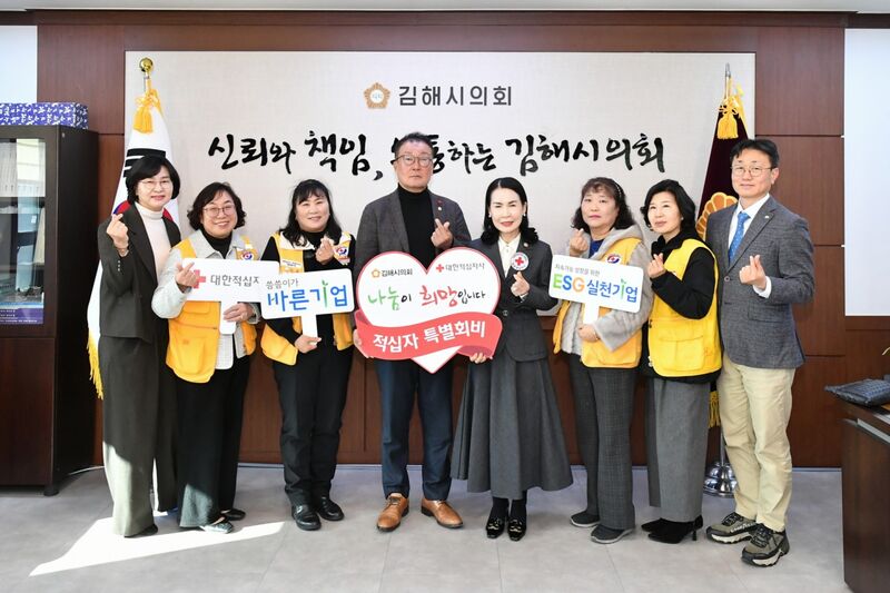 김해시의회가 2026년도 대한적십자 특별회비를 전달하며 지역 재난 대응과 취약계층 지원을 위한 인도주의 활동에 동참했다.