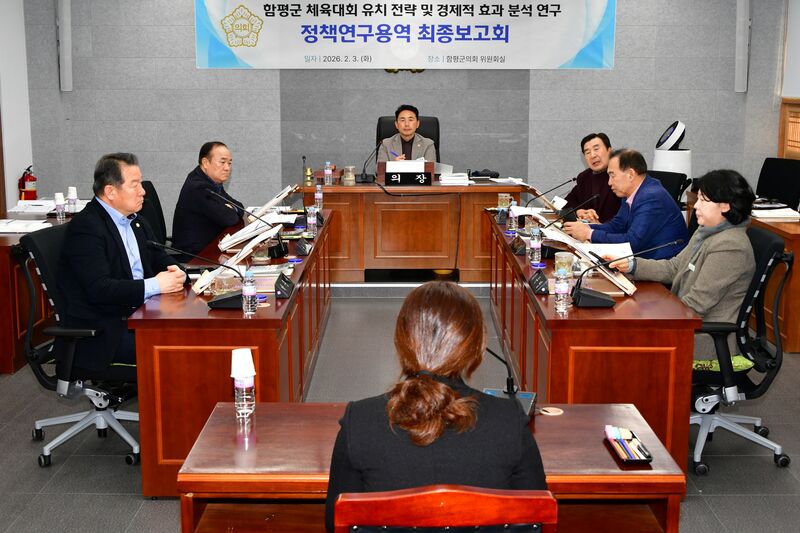 함평군의회(의장 이남오)는 2월 3일 의원연구단체인 ‘함평군 체육대회 유치 전략 및 경제적 효과 분석 연구회’ 주관으로 스포츠마케팅 활성화를 위한 최종보고회를 개최하고, 체육대회 유치를 통한 지역경제 활성화 방안을 논의했다.